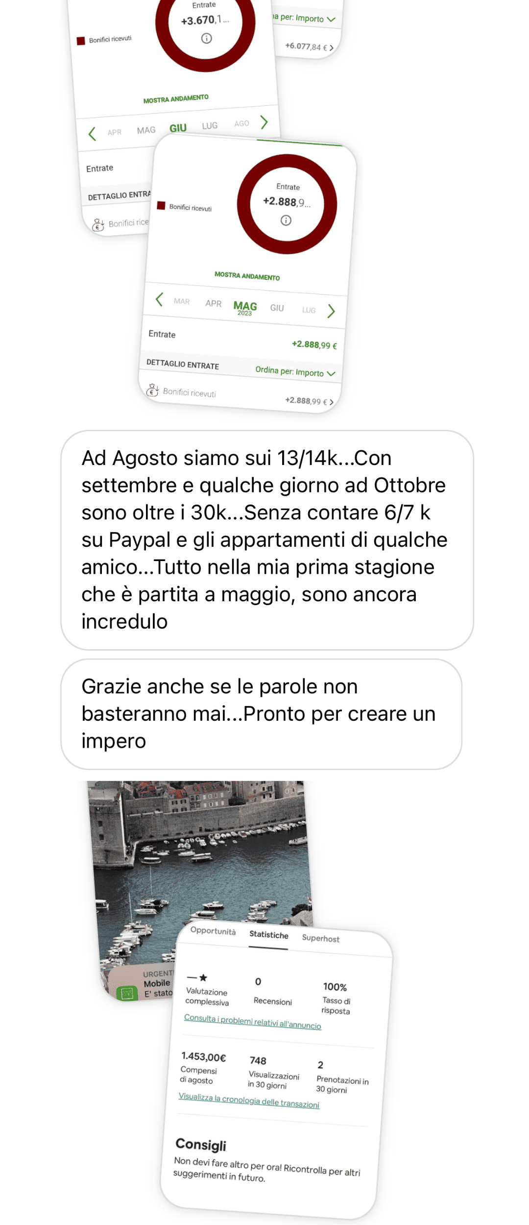 Un punto di forza che lo differenzia rispetto il resto dei formatori che non mostrano risultati o condividono solo dati parziali (es. solo le prenotazioni degli appartamenti in gestione)